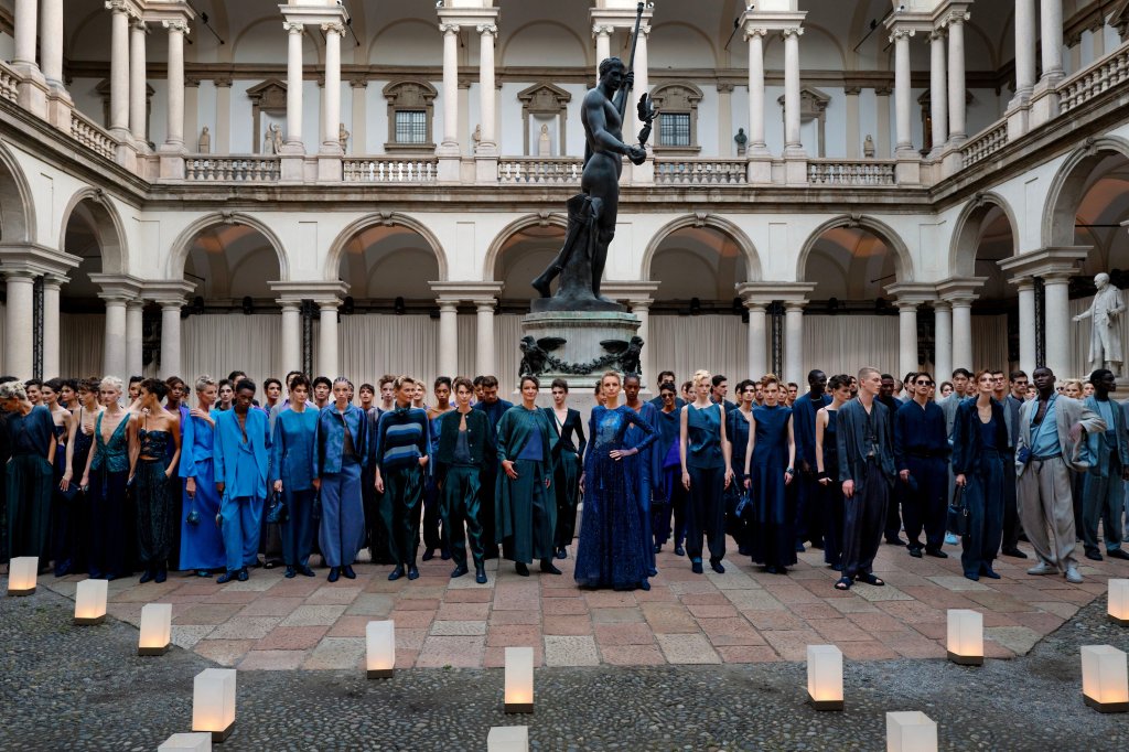 The casting highlighted not only Armani’s career but also the continuity of his vision. Models who had frequented his runways across decades returned, affirming the loyalty and intimacy that defined his presentations. Yet the most poignant moment came at the end, when Agnese Zogla, Armani’s longtime muse, stepped out alone after the others had departed. Dressed in a gown of sparkling deep blue-green with face of Armani embedded on top, she circled the Brera courtyard like Nyx, the goddess of night, as though she were bringing dusk to Armani’s long creative journey. It was an image that transcended fashion: a living allegory of closure, both mythic and deeply personal.51